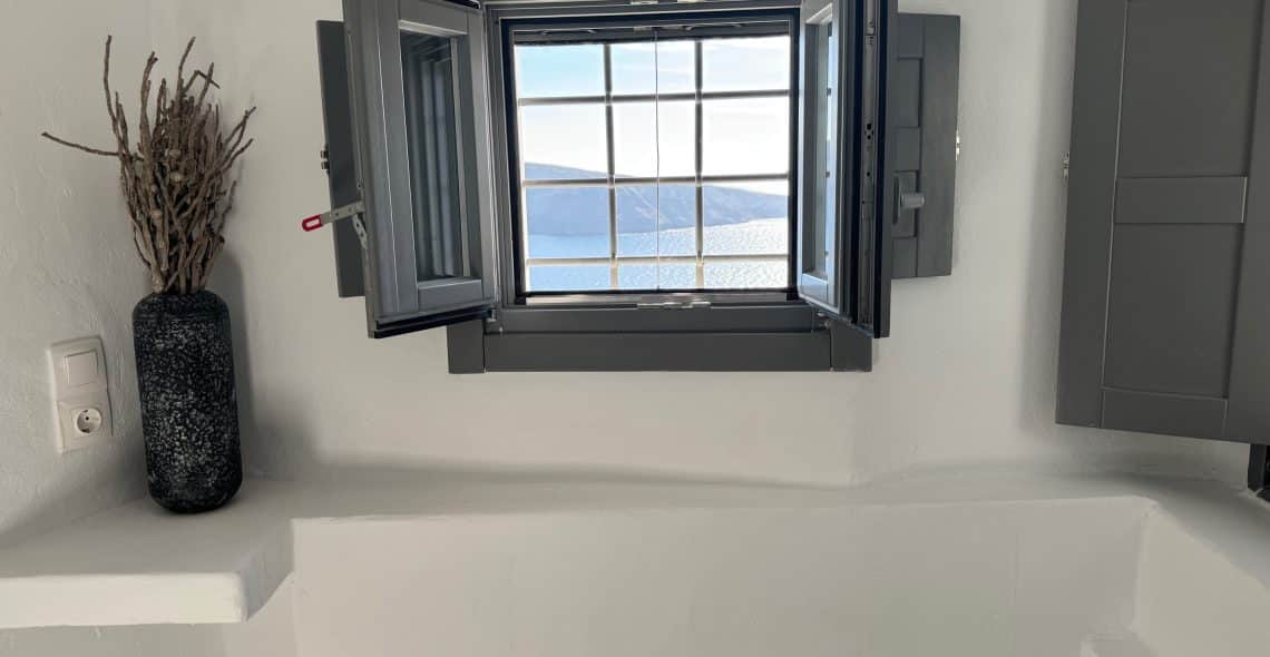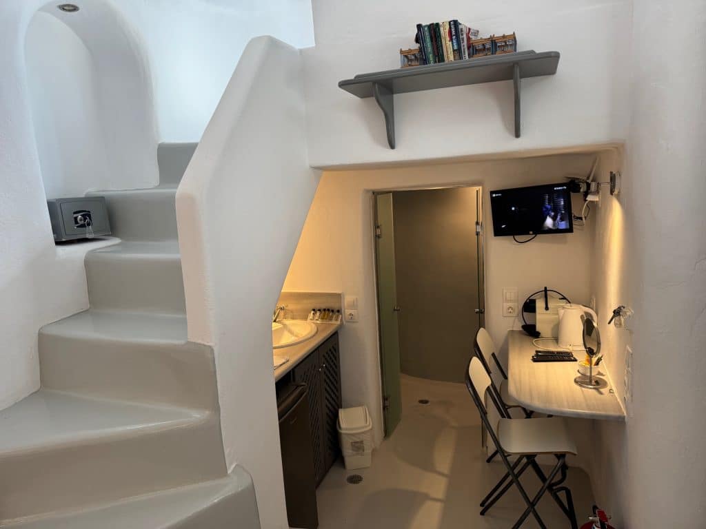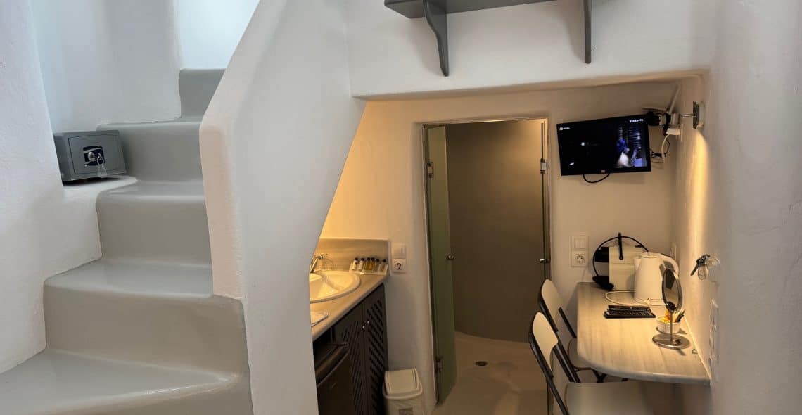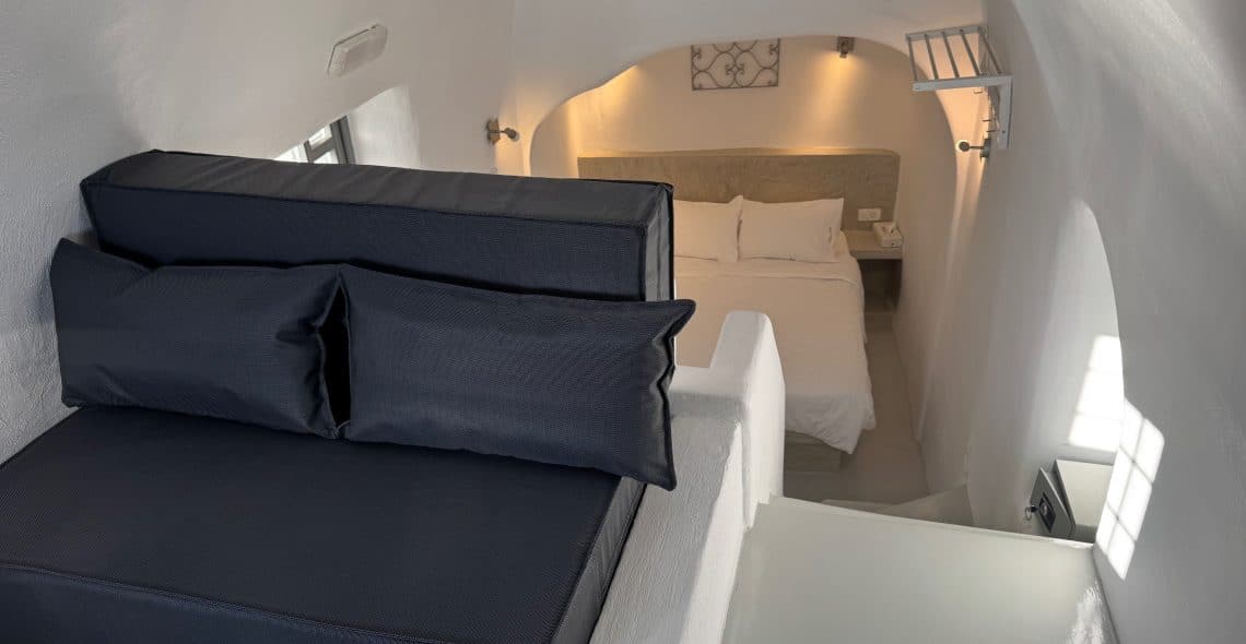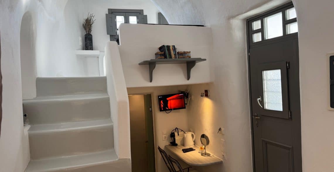 Petite Studio Loft of 12m² is located at the “Caldera” and includes a private hot tub on its roof terrace. From its terrace you can observe a great panoramic view of the sea and the volcano, as well as the surrounding islands and the world’s most famous sunset.